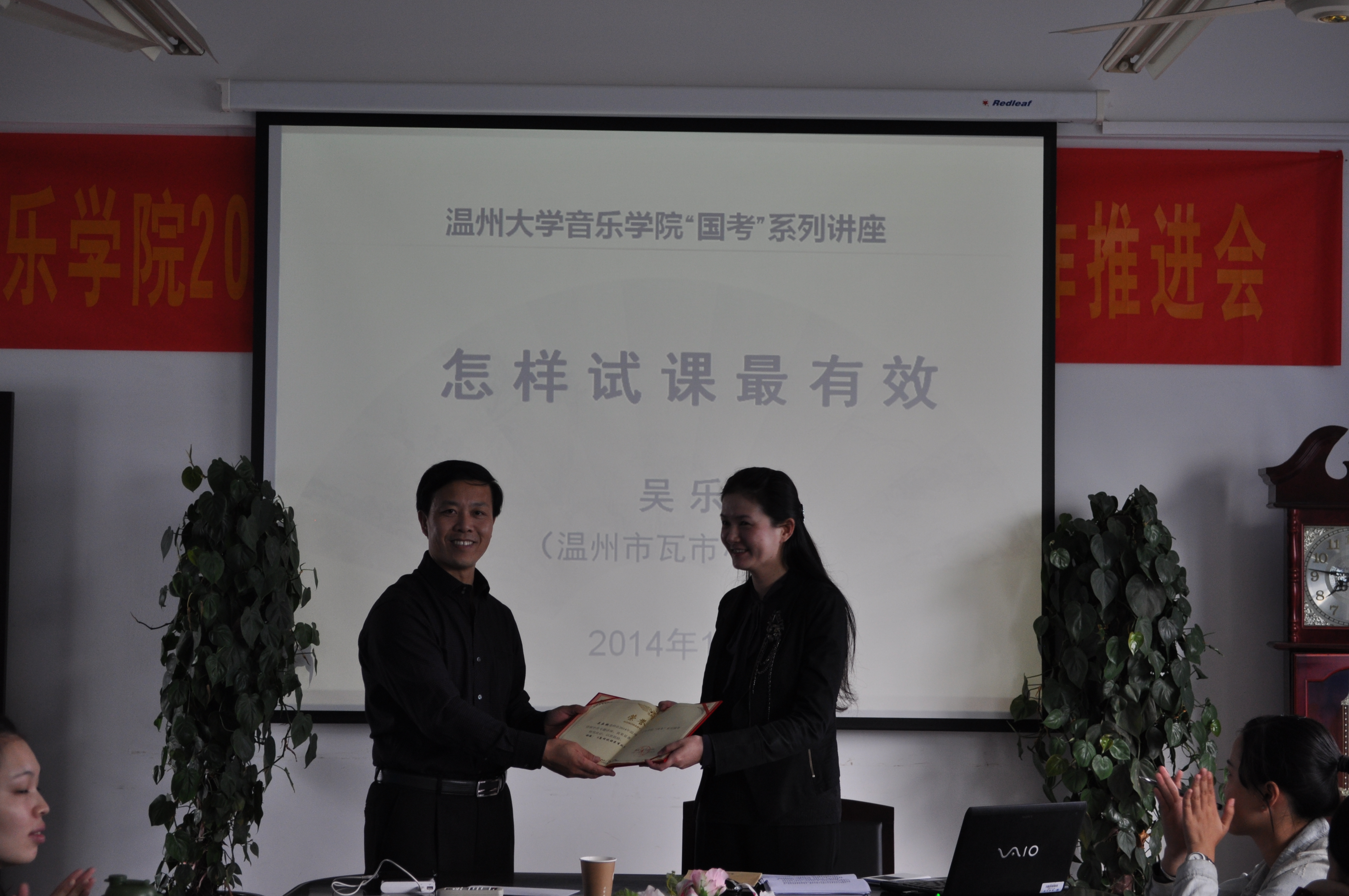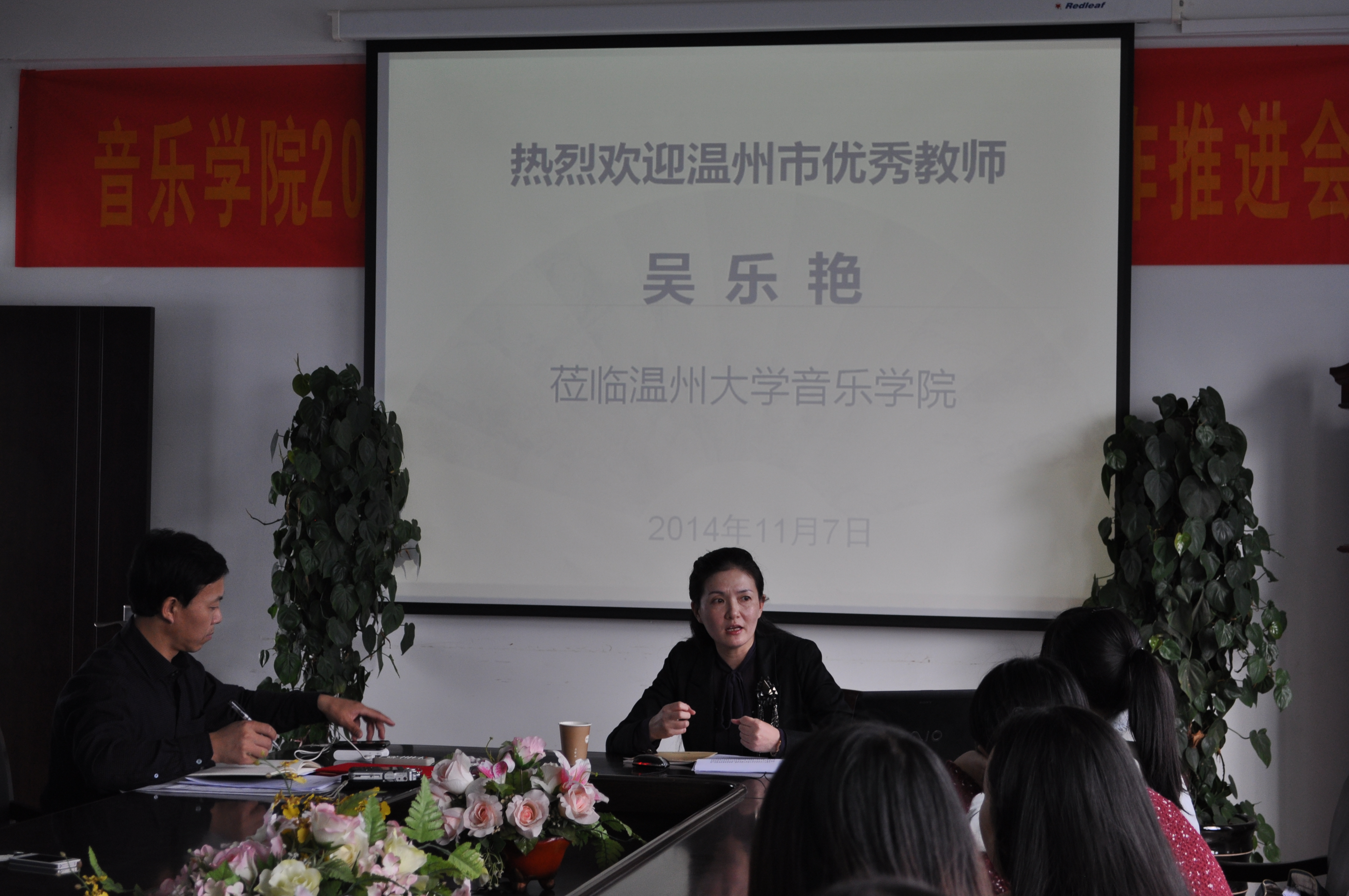 2014年11月7日下午,温州市优秀教师、教坛新秀,瓦市小学音乐教师吴乐艳莅临博彩平台大全 ,指点学生“试课”的有效途径。温州大学教学督导王守琢老师与博彩平台大全 的同学们一起参与了交流。该活动由王文韬副院长主持。 吴乐艳老师就学生“国考”、“考编”之音乐教师国家资格考试过程中的试课环节,给予音乐学、音乐表演专业的学生有益指导。她建议应考的同学,一定要熟悉现行的各个版本的音乐教材,同时要打好“自弹自唱”的技术难关。