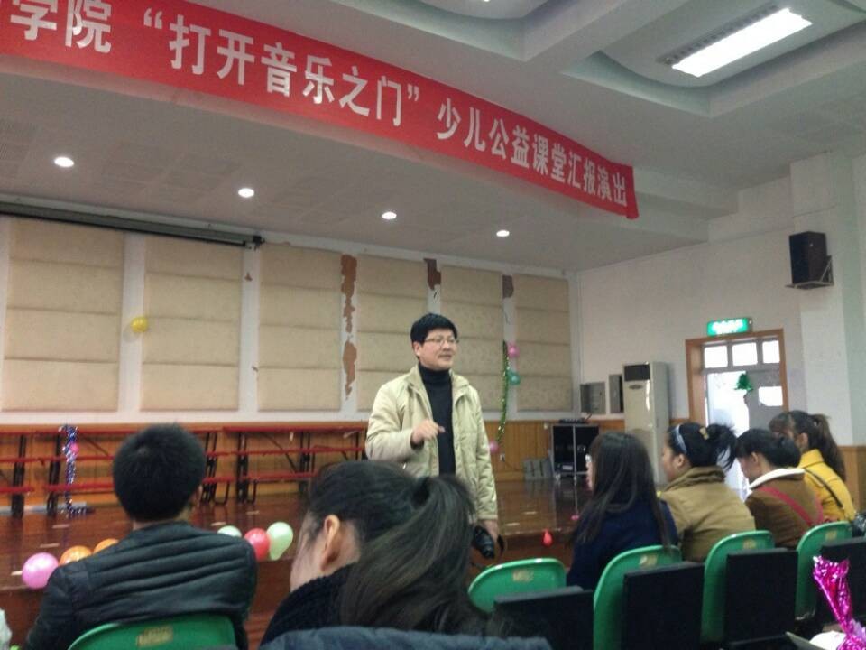 举办“打开音乐之门”公益讲堂活动的意义,以及对此次活动学生讲师和小朋友们表现的肯定,对各位教职工家长的支持表达了感谢。随后,汇报演出正式开始:两位身穿燕尾服的小朋友一起坐在钢琴前四手联弹一曲《小奏鸣曲》开场了整个演出,他们熟练的技艺征服了整个会场。合唱2班的小朋友们一起合唱了《虫儿飞》、《小雪橇》两首歌曲,带动了全场的气氛。乐理1,2班的全体小朋友也和他们的老师一起合唱了《哆来咪》、《小星星》,他们围着一起摇动他们的身体,带领大家一起走进那个美丽的世界。而合唱1班的《春晓》、《小乌鸦爱妈妈》更是令大家印象深刻,他们努力做齐动作,带着开心的笑脸,让现场的家长们都开心的鼓起掌来。最后的压轴演出是合唱2班的非洲鼓表演,节奏感十足的表演令大家都跟着一起摇摆起来,大家欢乐的笑着,唱着,仿佛置身于一个充满乐趣的音乐殿堂。