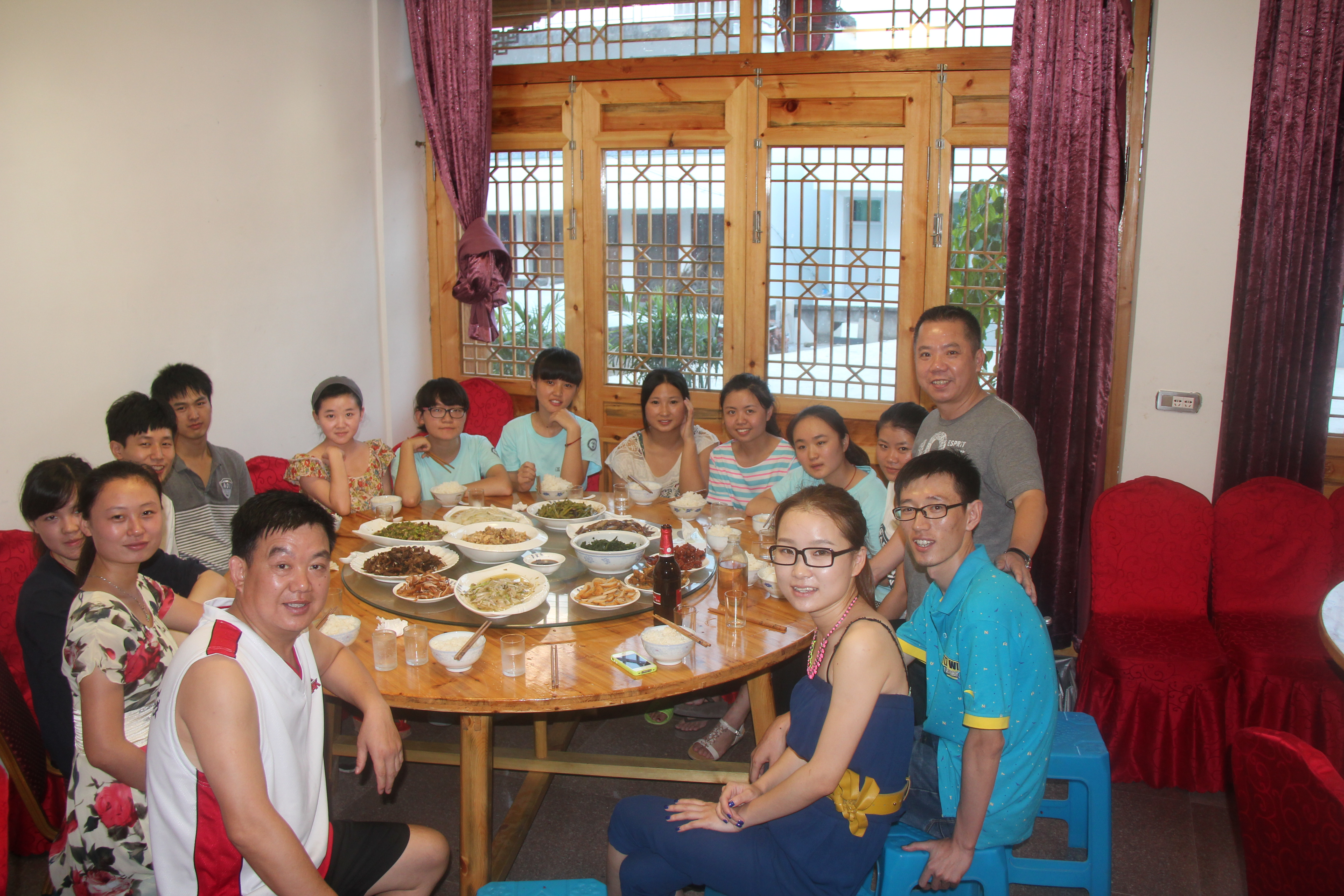 为了答谢村长、书记、旅店老板对我们的照顾,我们全体学生和老师准备了一顿丰盛的答谢午餐,我们邀请了村书记、 村长和副村来参加我们的答谢午宴。午宴显得十分热闹,我们还特别邀请了爷爷奶奶两位寿星来参加。在欢笑声、鼓掌声和碰杯声中,我们度过了欢乐的早餐时间。明天我们就要离开这段时间陪伴我们的畲族村了,我们非常地舍不得,虽然只是一段时间的日子,但是我们学到了更多,获得了更多。今晚的老师,不是以老师的身份和我们在一起,而是好朋友的身份一起吃饭,这让我们感到非常地轻松,所以我们向两位老师致敬!