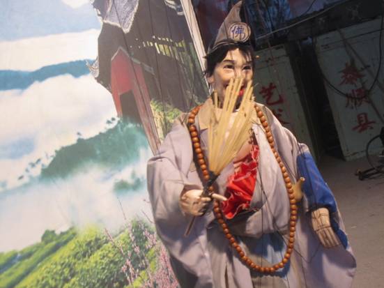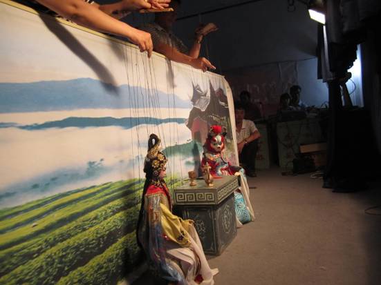 2012年6月30日下午,我们寻美实践团队在李葳老师的带领下来到了 泰顺罗阳县木偶戏团观看木偶戏 ,正面接触了这一独特的民间技艺。我们一开始观看了木偶戏的实景表演。木偶戏艺人为我们一共表演了五场木偶戏 ,有现代宣传党中央思想的《共谱和谐篇章》,神话类的《真假牛魔王》,传奇类的《济公讲故事》,历史类《县令上任》,歌舞类的《大家一起跳起来》,演出精彩绝伦,融入瓯剧、京剧、快板、相声、歌舞、变脸等多种艺术形式,体现出艺人们高超的演绎技巧和精湛的演唱水平。节目中特别是现代与古代的相结合最为精彩,《济公讲故事》通过孩子们和济公的对话, 让我们了解了八荣八耻, 了解了泰顺的特色美景, 不仅有教育意义还对泰顺起了很好的宣传作用。后来,在演出结束之后我们被木偶戏的美和趣所吸引,不禁都想试一试。于是在老师的指导下我们大胆的进行了尝试,当我们拿起木偶时,感觉很重,一只手控制上面的面板,另一只手要操控这们多的提线,而且不同的提线要控制木偶不同的身体部位。大家体会艺人们的不易,开始尝试让木偶做动作,好几个同学被一根根线给弄怕了,手就像锈了的机器,不知如何动,而交换给艺人手中,那灵活的控线技巧,让傀儡似乎活过来。在一番不懈的努力之下,李凌翰和徐昊同学终于学会了走路与开关折扇,心中无比高兴。最后,在学习控线木偶之后,实践队员又和艺术家们在一起座谈。其中一位艺人向大家介绍了木偶戏的几个重要点:模式、音乐、服饰和技巧让我受益匪浅。而团长王景快也对木偶性的发展提出了自己的担忧,大家也就木偶戏的创新和传统继承问题上与艺人们交流讨论,很多同学都对木偶戏的发展和传承提出了自己的观点。