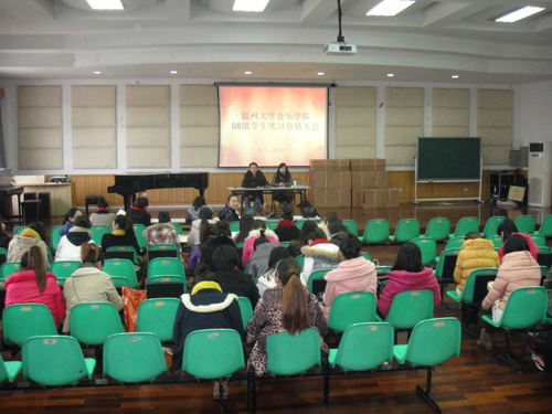 2011年12月30日下午1:30,在音乐楼201召开08级学生实习总结大会。全球博彩平台大全网站 副院长王志毅、教师李葳、王秀敏、许天鸣、杨古侠、张晶晶以及08级学生出席了此会议。会议由李葳老师主持。王副院长先对全球博彩平台大全网站 学生实习情况作了简单的介绍,并充分肯定了实习带队老师的工作以及学生在实习过程中的认真态度。部分实习学生在会上分享了在中小学校实习的感受及获得的知识。最后副院长王志毅老师就同学们提出对实习的意见进行了一一的解答,此次会议持续了两个小时。