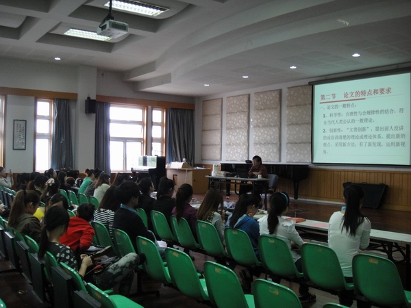 讲座上,陈教授就前几届毕业生做毕业论文时遇到的问题和不足来提醒08级毕业生选题一定要新颖,避免陈词滥调。“一个好的题目,等于论文成功的一半”,这是陈教授强调选题的重要性时说的一句话,简洁却鞭辟入里。此外,陈教授也强调了无论在写开题报告、文献综述或是论文写作时,都要严格遵守学术道德与学术规范,论著要界定准确。陈教授还通过PPT详细而直观地讲授了论文写作的格式、文献综述写作的方法等。最后,讲座在同学们热烈的掌声中圆满结束。同学们都为陈教授幽默的言辞、渊博的知识所折服。