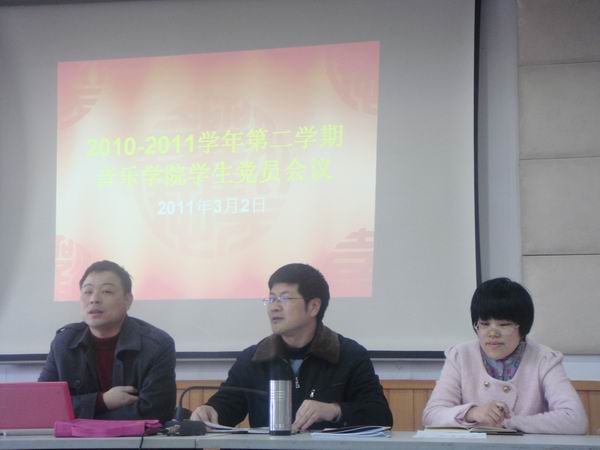 2010-2011学年第二学期全院学生党员会议在音乐楼201召开。院党总支书记刘青松、学生科科长周帆、辅导员及全院学生党员出席了会议。会议由学生科科长周帆老师主持。