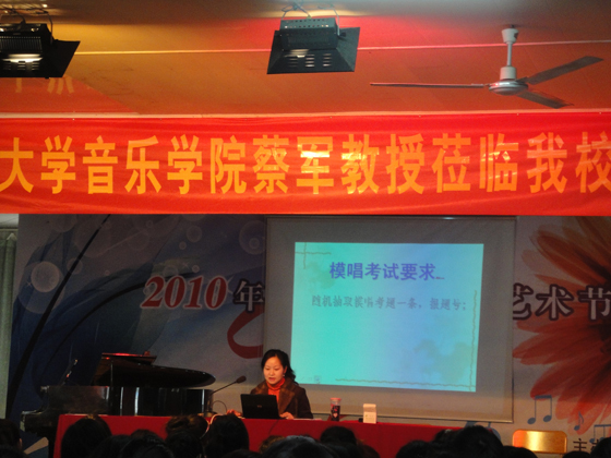 蔡军老师应邀瓯海少艺校,为130名师生进行一场《视唱练耳应试指导》的讲座。蔡老师系统地介绍了浙江省及省外各音乐院校招生考试中视唱练耳部分的内容及考试要求。并针对学生一些普遍的存在的问题进行了辅导。强调对学生三个能力的培养:1、耳朵对音的注意力;2、对音乐各要素的分析和理解能力;3、音乐的表达能力。在讲座上蔡老师从几个音乐要素出发,引导学生对音乐各要素进行分类、对比、想象、记并回忆,现场指导练习并希望学生学会自主学习!
