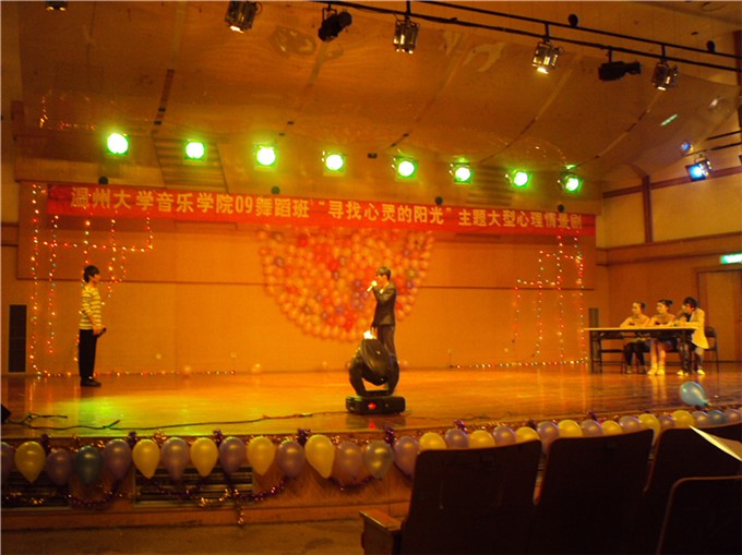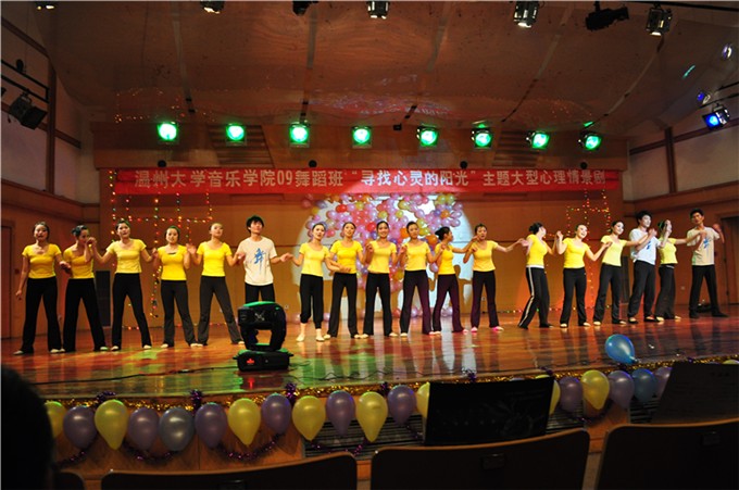 09舞蹈班承办的“寻找心灵的阳光”大型心理情景剧在温州大学北校区音乐厅隆重举行。学院刘青松书记、兄弟学院团委学生会干部及学院师生500多人观看了表演。