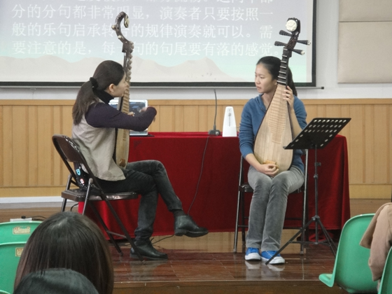 两位老师的授课有异曲同工之妙, 董凌凡老师通过激发学生的思维想象使之准确掌握琵琶左手手指弹法, 李兵老师通过调动学生的情感情绪使之把握发声的感觉,从而使学生在积极活跃的心境中轻松掌握弹奏及演唱的技巧.整堂课堂教学内容丰富全面,教与学双方互动十分频繁,产生了良好的课堂效果。