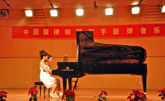 本次四手联弹的曲风都是中国风的,由08、09级的同学共同演奏。共13首,分别是:黄洁洁、范琼带来的《青春舞曲》,林珂珂、孙媛媛带来的《让我们荡起双桨》、《大红枣》,成柳、倪涵文带来的《送我一支玫瑰花》,林张妙、黄洁洁带来的《对花》,娄海晓、叶睛睛带来的《模仿》、《萨丽哈》,高依依、成柳带来的《茉莉花》、《北风吹及窗花舞》,胡乙平、章雨露带来的《步步高》,毛成帅、胡乙平带来的《扎红头绳》等。晚会在林张妙和特邀嘉宾雷成靖的《春节序曲》中圆满结束。