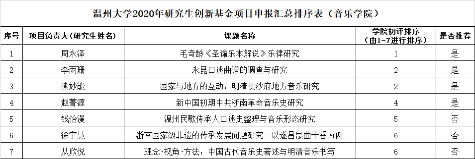 根据学校《关于2020年度研究生创新基金项目申报的通知》以及《关于印发<温州大学研究生学业奖学金管理办法>等3项研究生教育制度的通知》等文件精神,经学生个人申请,专家评审,学院审核,拟推荐以下项目,现予以公示。