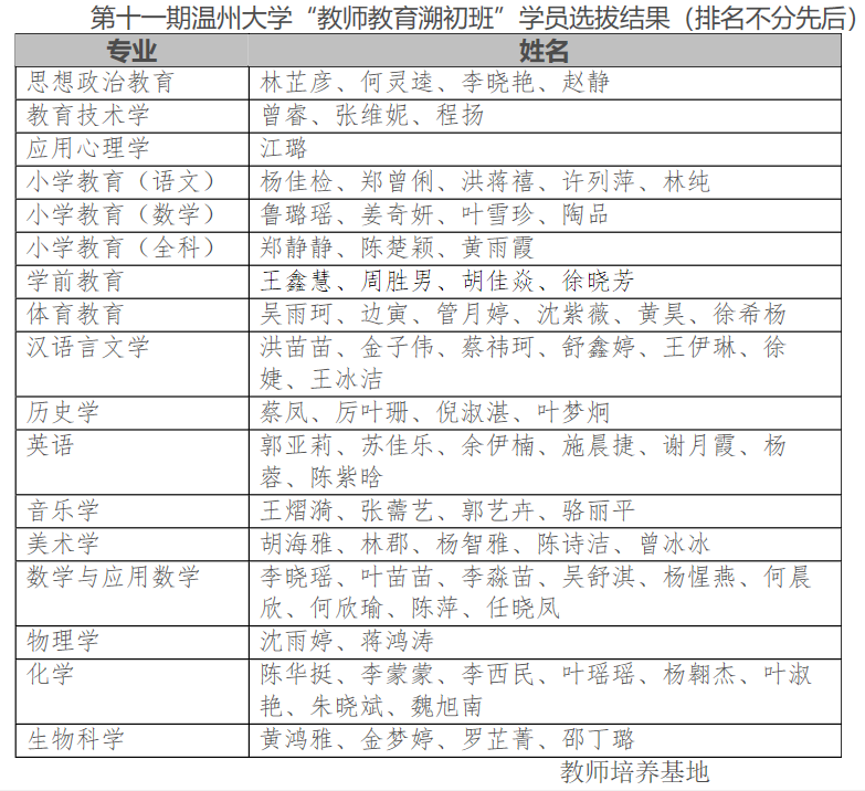 根据《温州大学“教师教育溯初班”管理办法(2019年修订)》(温大行政〔2019〕189号)文件精神,经过各学院对自愿报名学生的初选,教师培养基地对入围选手的面试,上报校领导审核后,拟录取林芷彦等80名学生为温州大学“教师教育溯初班”第十一期学员。现将选拔结果予以公示,公示期为三天(10月21日-10月23日),如有疑问,请与朱伟老师联系,电话:86590532、665134,E_mail:[email protected]。