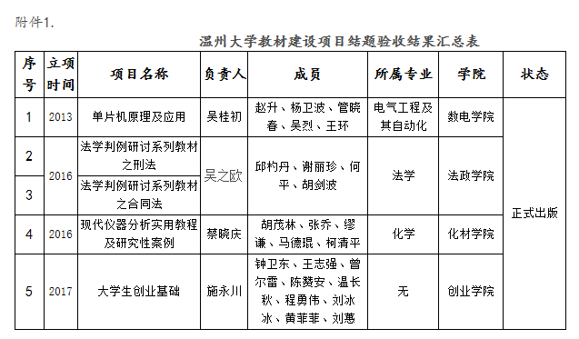 根据《温州大学教材建设管理办法(修订)》(温大行政〔2012〕267号)的相关规定,经学院初审、学校复核,同意5项教材建设项目结题。现将具体名单予以公示,公示时间为三天(3月14日-3月16日),如有疑问,请与教务处专业建设促进中心联系。联系人:刘扬,电话:770291。