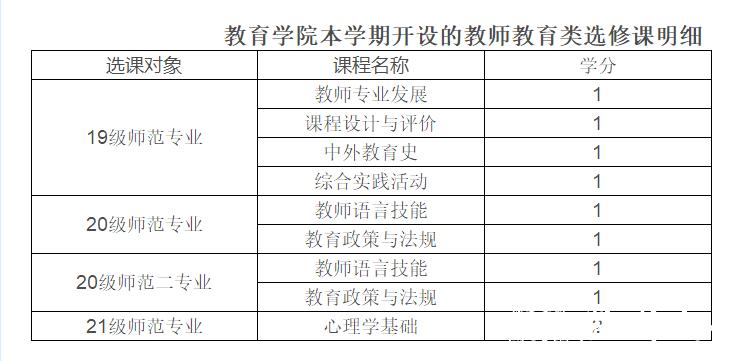 根据温州大学师范类专业本科人才培养方案要求,师范生需修读教师教育类选修课,19级、20级、21级学生需修满3学分(具体以各自专业的培养方案为准)。该类课程设置分为教育学院面向全校师范专业统一选课开设及学生所在学院专业内独立选课开设两类。现开展教育学院面向师范专业开设教师教育类选修课选课工作,具体如下: