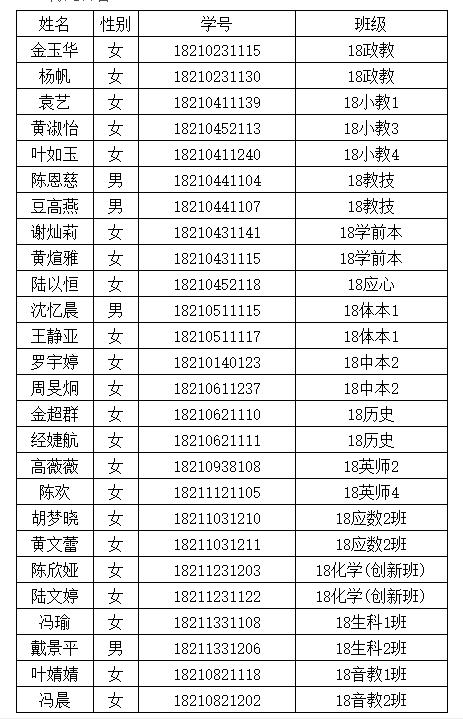 2020年10月,经公示,金玉华等26名同学成为了第十二期教师教育洋初班跟读学员。一年来,26们同学服从溯初班的各项管理规定,认真学习、积极参加溯初班的所有课程与活动、按时完成溯初班的所有作业和训练,获得溯初班指导老师和其他学员的充分认可。经研究决定,根据《温州大学教师教育溯初班管理办法(2019年修订)》(温大行政〔2019〕189号),从即日起吸收金玉华等26位同学成为第十二期溯初班的正式学员(名单见下表)。希望她们继续努力学习,完成溯初班的学习任务。